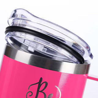 - Pink powder-coated mug with laser engraved text