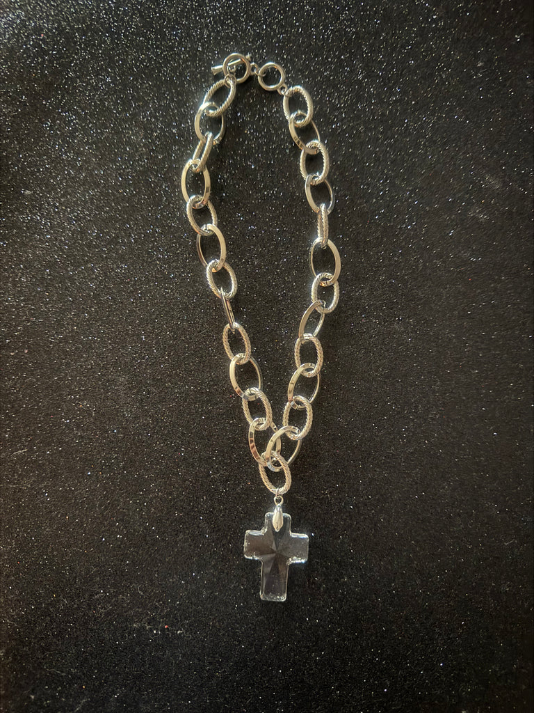 Our clear cross chunky link chain necklace is a statement-making accessory made from transparent acrylic. The design features oversized, thick links that are characteristic of chunky jewelry, and a prominent cross pendant that is the focal point.