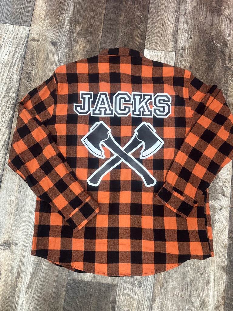 Who doesn’t love a flannel on a crisp cool fall day? Our Orange & Black Buffalo Plaid Flannel Shirt is ideal for Lumberjack season with the Jacks design on the back!
