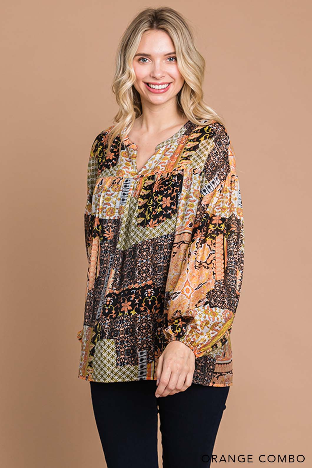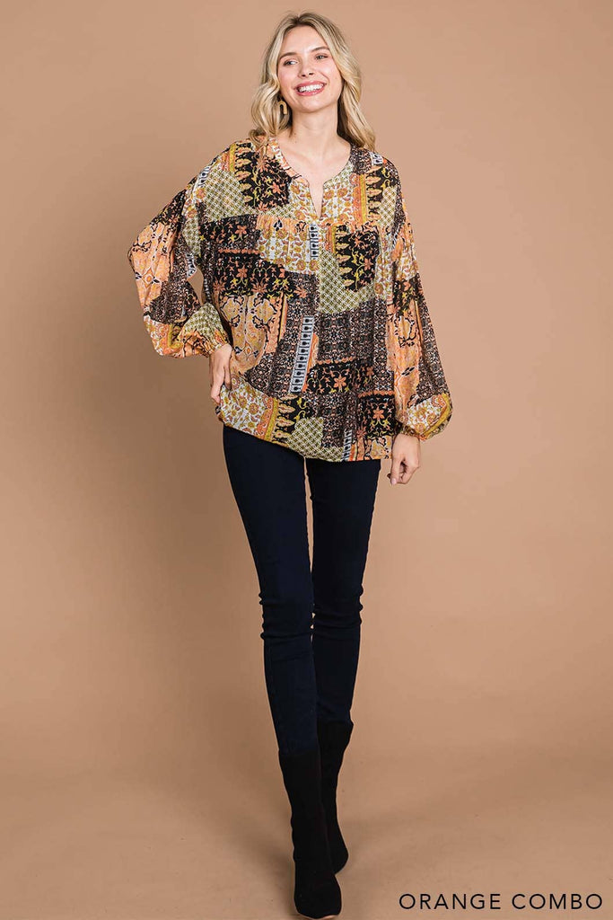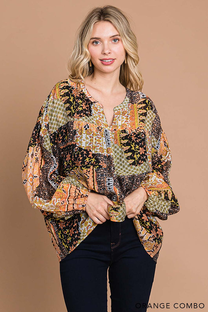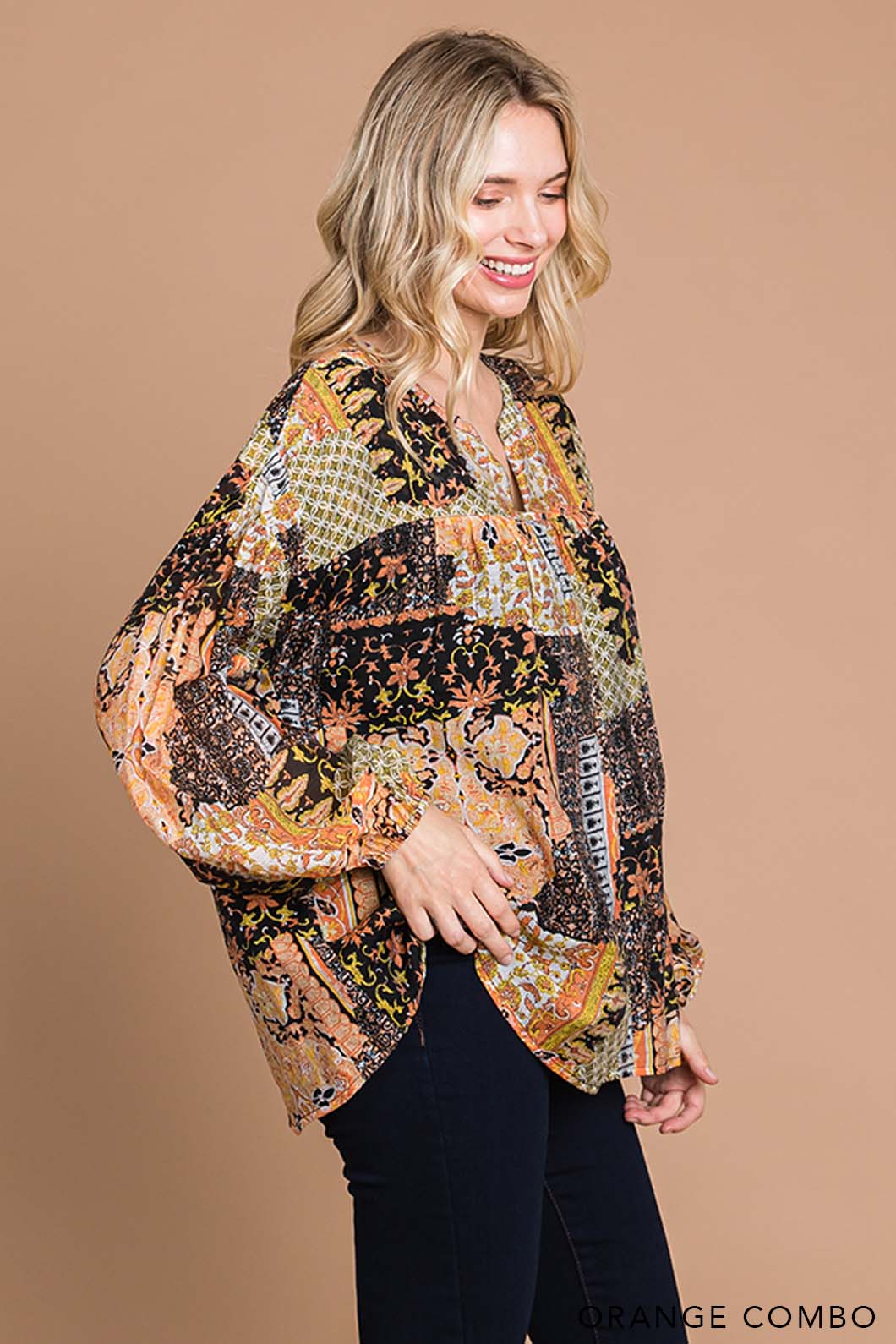 Women's Boho Mix and Match Print Bubble Sleeve Top