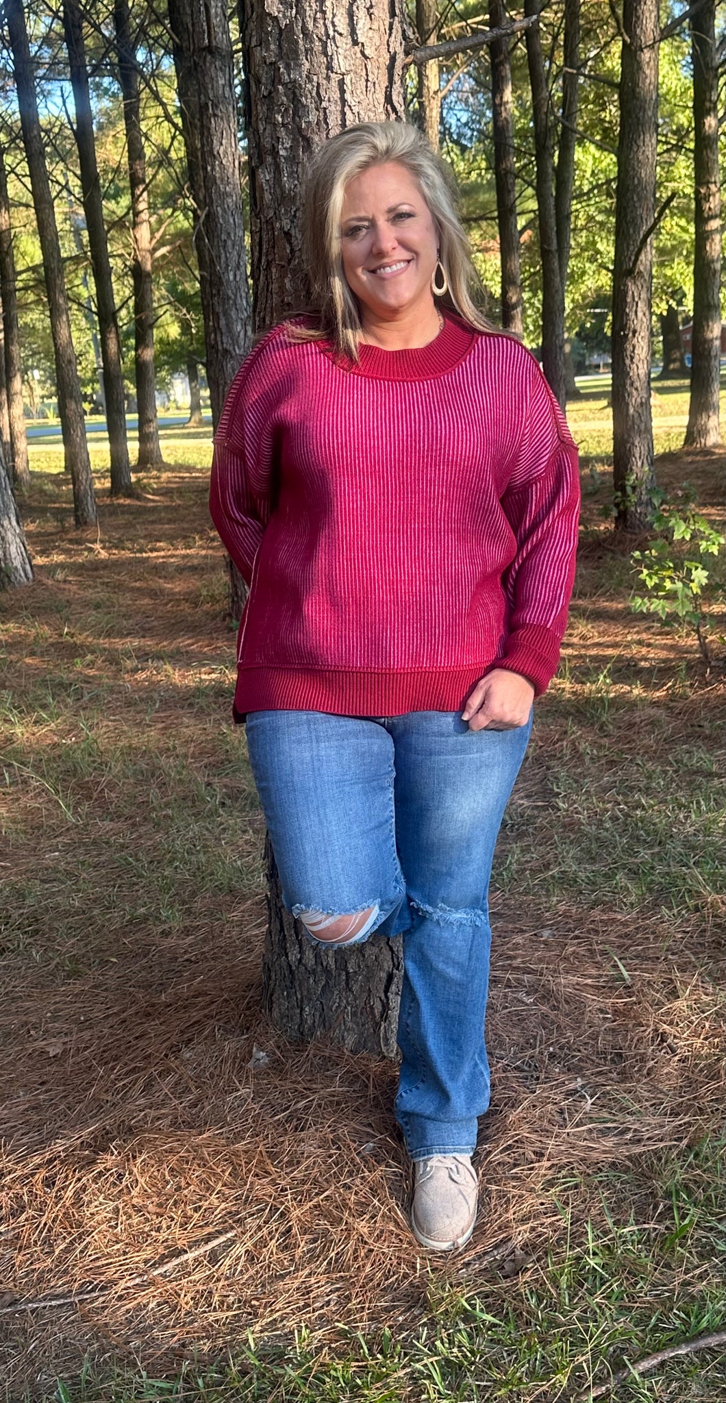 Exposed Seam Two Tone Sweater-Cabernet/Candy Pink