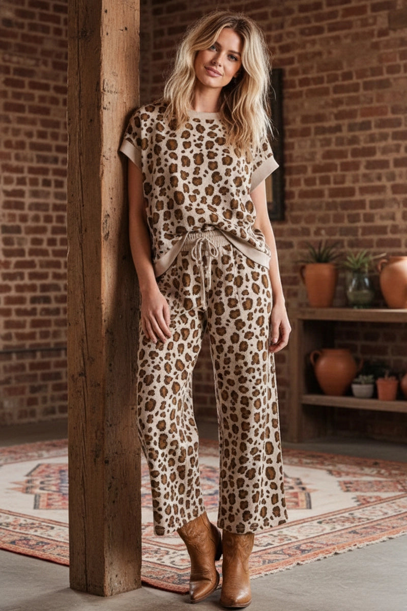 Leopard Print Scuba Top and Pants Set - Women's Matching Outfit
